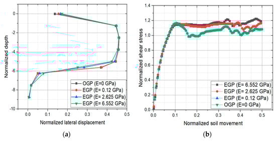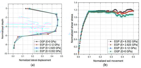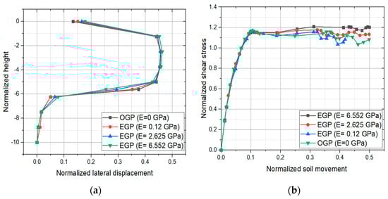 The effect of geogrid modulus on shear behavior-soil movement was studied using the finite differences method for different lengths of ordinary and encased granular columns (L/D = 8, 10 and end bearing); here L = the length of the column and D represents the diameter of the column. Figure 5, Figure 6 and Figure 7 explain the variations of the normalized shear stress (which is the shear stress after improvement divided by the shear stress of the soil (τimp/τsoil)), with the normalized soil movement ((δ/D) where δ is the lateral soil movement) behavior of sand improved with ordinary granular columns (OGC) and geogrid encased granular columns (GECs). Different values of the modulus of elasticity have been used in the analysis as shown in Table 3. It concluded that increasing the modulus of elasticity of geogrid contributes to increasing the overall resistance of the soil against lateral movement easpecaiily at the shear plane as shown in Figure 5a, Figure 6a and Figure 7a, the reason behind that is the overall stiffness of the granular columns was increased [,,]. The use of geogrid encased columns can also improve the load distribution in the soil, which can lead to a reduction in the shear stress on soil particles [,]. It was noticed that the largest effect of geogrid occurred on end bearing geogrid encased granular columns. The values of shear strength were increased by (17.7)%. Furthermore, it was found that the geogrid has a positive effect on the value of the lateral displacement of the column. Increasing the modulus of elasticity of the geogrid led to an increase in the overall resistance to lateral diplacement as shown in Figure 5b, Figure 6b and Figure 7b.