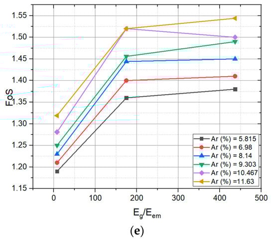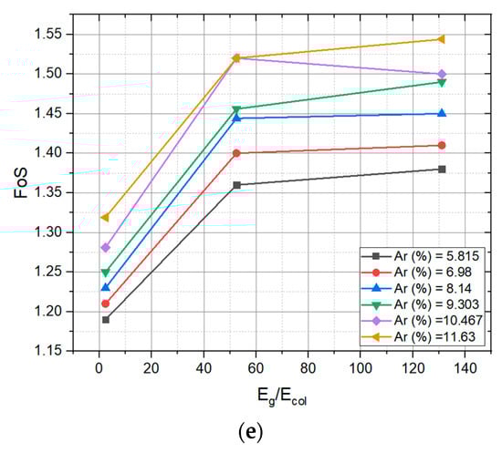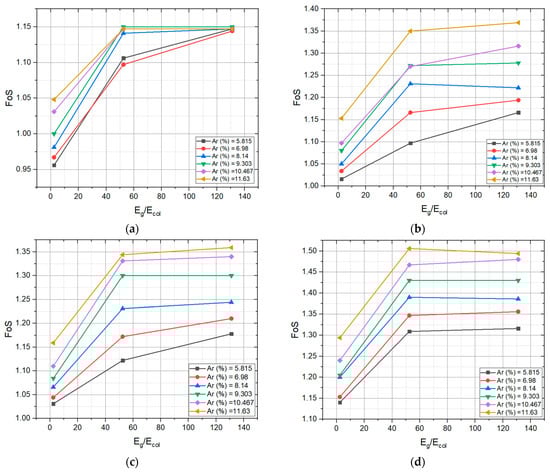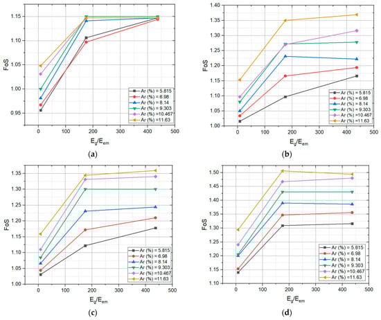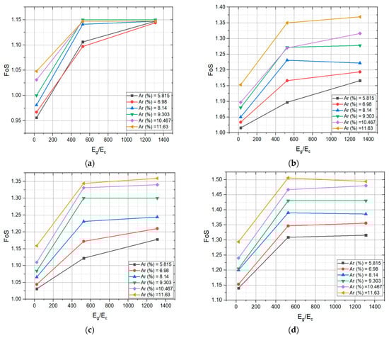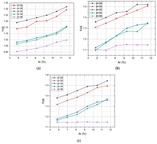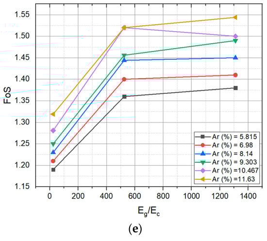 Figure 10, Figure 11 and Figure 12 show that at the relatively high angle of embankment slope (β). It was observed that factor of safety (FoS) values increases with an increase in the stiffness ratio of the geogrid with respect to the other materials (i.e., embankment, clay, and column). On the other hand, very minor effect for the area replacement ratio (Ar %) was recorded on the factor of safety in the high stiffness values. At low angle of embankment slope (β) values, the stiffness ratio values have led to positive effects on the stability of the embankment. The amount of increase (as comparing to high β values) was found to be higher. The reason behind this is that the geogrid increases the length of the slip surface and increases the friction along the shear plane. Furthermore, in high stiffness values, the geogrid granular columns GECs contribute to delay the plastic (yielding behavior) in the soil [] by mobilizing higher forces (stresses) [].