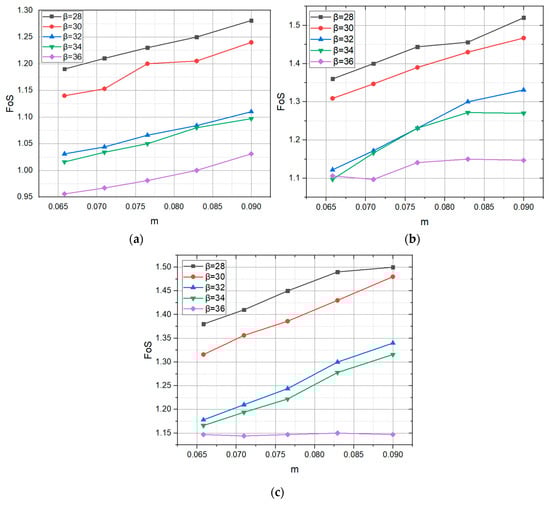 The variation of the factor of safety (FoS) of a clayey sand embankment with the stability number (m) for various geogrid elastic moduli (E) at various values of the slope angle (β) is addressed in Figure 9a–c. It has been observed that the factor of safety (FoS) tends to rise linearly as the stability number (m) increases. Furthermore, it is discovered that the FoS is inversely proportional to the slope angle (β), which means that a rise in the slope angle causes a fall in the FoS [].