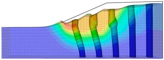 As reported in Figure 13, the failure mode identified in the slope prior to reinforcement was deep-seated slope failure. Inserting of ordinary and geogrid encased granular columns contributed to changing the type of failure from deep-seated failure to shallow slope failure with higher factor of safety. Further analysis revealed that the OGCs reinforcing the slope failed due to bending, while the OGCs reinforcing the body of the embankment failed as a result of bulging [,,], as shown in Figure 14. On the other hand, GECs (geogrid encased columns) failed due to bending failure. Increasing the stiffness of the geogrid decreases the bending failure of the column. Granular columns at the embankment’s centerline experienced substantially lower lateral movement compared to those supporting the inclined portion of the embankment (the toe). More pronounced lateral displacements were seen in the GECs on the slope than in the embankment’s body. The column—soil system’s overall stiffness tends to rise due to the confinement effect given by the geogrid encasement. Thus, the safety of the slopes generally increases. The surface settlement of the embankment was found to be improved during using geogrid encased granular columns as shown in Figure 15.