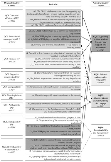 The rest of the original criteria are divided into different factors, which provide insight into the consistency in an applied CAM. Firstly, educational consequences (QC6) contribute mainly to KQF1 (efficiency in time, student tracking and support, and assessment) in terms of helping to improve student engagement, extending teachers’ capacity for assessment and being useful for additional student assessment. In turn, the indicator referring to the activities that help students to stay engaged in the learning process is linked to KQF3 (meaningfulness and authenticity).