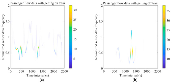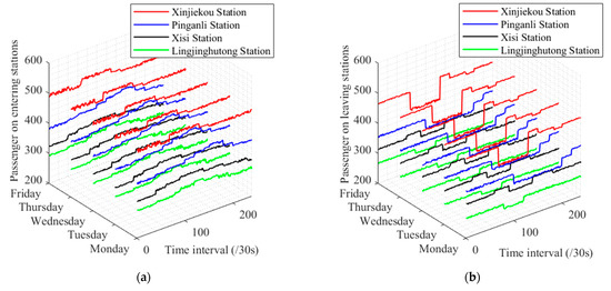 The time when the kth passenger arrives at the ith platform is defined as ; the passenger waiting time at the ith platform is calculated by Equation (27).