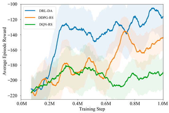 As shown in Table 8, the DRL-DA algorithm has more state transfers than other algorithms, and the average reward value obtained is higher, indicating that the DRL-DA triggers less termination of training and better learning. Due to the algorithm structure of Q learning, Q learning chooses discrete vectors for the action space, which has some limitations in simulation generalization ability and is slightly less effective. However, due to the relative simplicity of the algorithm, the training time is relatively fast. The DQN algorithm is relatively slow in computing efficiency due to the complexity of the algorithm compared to the reinforcement learning algorithm. At the same time, because the artificial neural network training has a certain degree of randomness, the training results are prone to fluctuations, which can be improved by adjusting the reward function weights and improving the neural network. Compared with other algorithms, the proposed algorithm requires less data. Through the direct interaction between the environment and the agent, it continuously learns and corrects each step of the action without the need for complex operation conditions settings. Therefore, compared with other algorithms, the proposed algorithm is more convenient and shows better performance.