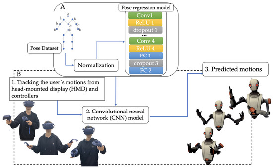Figure 1 illustrates an overview of the proposed method. Our method comprises two parts, A and B. Part A is dedicated to the training step of pose regression, and part B focuses on the avatar animation step. Part B renders avatars in virtual reality following users’ motions in the physical world.