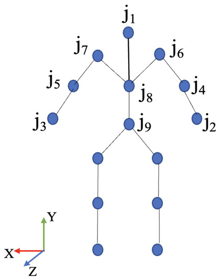 Figure 2, we name each joint in order: head, left hand, right hand, left elbow, right elbow, left shoulder, right shoulder, spine, and pelvis, referred to as