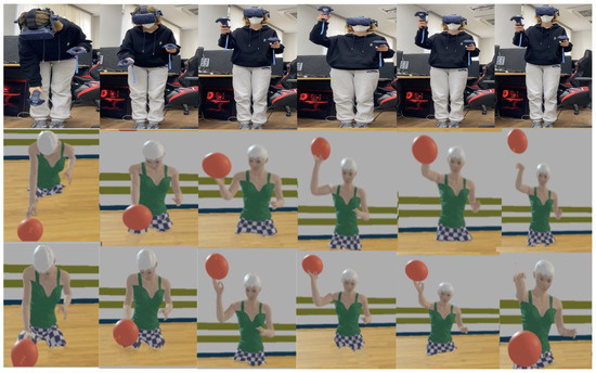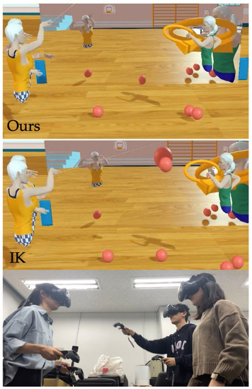Figure 10 shows the avatars in a ball-grabbing game using our method at the top, an IK method in the middle, and VR users at the bottom. Ball grabbing and throwing poses of avatars match the poses of the users in both IK and our method modes. A user throwing a ball needs to pay attention to the pose of another user with a basket. Vice versa, a user receiving a ball needs to pay attention to the pose of the throwing user. We asked 15 participants to form five groups of three users randomly. As depicted in