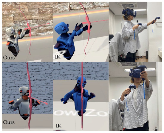 Figure 9 shows an archery game with our pose-estimated avatar in the leftmost column, the IK-based avatar in the middle column, and the VR user in the rightmost column. As a user manipulates hand-held controllers, avatars mimic the user’s motion to shoot the arrows.