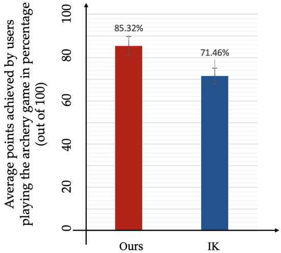 Figure 12 illustrates all participants’ average points for two modes. With our pose regression solution, participants obtained average points of 42.66 (85.32% of the highest possible points) and 35.73 (71.46% of the highest possible points) using an IK solution. Participants obtained higher average points with our proposed pose regression method.