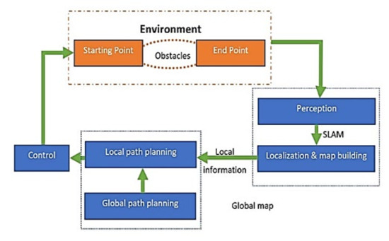 RL is concerned about an agent that discovers how to execute a specific task through trial and error while interacting with unknown environment parameters, which provides feedback regarding reward at the end, as shown in Figure 3. The interaction of the agent and the environment is a continual process. Initially, at time , an agent receives information about its environment from its sensor’s input , based upon which the agent selects an action from the set of the possible actions, then action is executed in the environment [5]. The action performed in the environment according to the state value , and its effect that the agent receives a scalar reward and a new state . The main target of the agent is to maximize the reward it receives from the environment after more trials. Due to this, the agent calculates an action-value function that maps state-action pairs into the corresponding expected return. DRL has broadly been used for various applications, including but not limited to computer vision [6,7], robotics [8], natural language processing, video games [9], education, transportation, finance, and healthcare. Zhang et al. proposed a novel danger-aware adaptive composition framework method for self-navigation [10] and a map-less navigation method for robot navigation [11]. Shao, Yan et al. solved a robot navigation problem with the novel method of DRL with a graph attention network (GAT) among external autonomous agents [12].