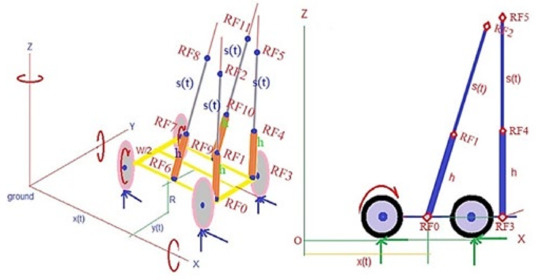 Mathematical models are used to model a system using symbolic computation. This approach helps analyze the dynamics of robots in real-life situations. During the modeling phase, four key components are considered: wheels, bodies, vertical joints, and intelligent devices. Figure 8 shows a schematic representation of the telepresence robot according to the coordinated reference system. The coordinate system for measuring the robot’s position relative to the global reference system for each reference uses a Cartesian coordinate system. Independent coordinates are the vertical displacement and angular rotation of the wheel, as well as the stresses arising from sliding during horizontal and vertical displacements. To simplify this, we used a 2D model to look at the vertical displacements and rotations of the ramp. Lateral displacement is measured as irrelevant here. Overall lumped gravity central point is chosen in and in a side view of the diagram.
