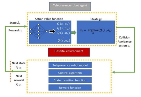 The Proposed approach is to control telepresence robots in assisting with human teleoperators. The primary point of the approach is to design and train a GRU-based DDQN to estimate the agent’s state-action value function. RL is a target-based learning algorithm that can learn and execute decisions autonomously to particular problems. It focuses on agents’ learning by direct interaction with the environment without supervision signals, which is different from other algorithms. The agent performs a mapping of the current scenario into actions so that the agent receives the maximum reward. The agent discovers which actions should be taken to maximize the reward by exploring and trying different actions. The decision-making process affects the immediate gain, the following scenario, and the future return of the actions taken. The essential characteristics of RL are trial and error and delayed gain. The RL system has four significant elements: policy, reward signal, value function, and environment modeling apart from the agent and environment. The reward signal value is the reward given to the developed agent in the form of a value function by the environment. The policy controls system decisions, and the strategy function typically establishes the action, as shown in Figure 10.