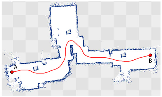We conducted multiple physical tests on the specially developed telepresence robot using ROS to validate the model’s performance in practice. Numerous tests on the telepresence robot are conducted to reduce the error. The site is a cardiologist ward in the Government general hospital, Ghulam Muhammad-Abad, Faisalabad. The distance for traveling a telepresence robot from the initial point (doctor’s office) to the endpoint (admitted patient ward) is 10.5 m. We use the Lidar to reconstruct the hospital environment. The telepresence robot starts its journey from point A in a hospital environment which is the main entrance of the reception area as shown in Figure 12. It drives through the main lobby while avoiding different static obstacles and reaches destination point B, which is the admitted ward of patients.