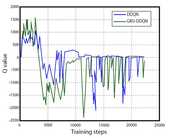 A value-based reinforcement learning technique is called Q-learning. To find the best course of action, Q-learning modifies the Q value of each action-state combination using the Bellman Equation. Furthermore, a dual network structure can lessen the correlation between the present and target Q values and increase the method’s stability. The input value is the state in which each intelligence is present, and the goal function is the Q value corresponding to each action to train the neural network. As shown in Figure 13, the proposed framework has a quicker intersection in the Q value graph after iterations of 4500 training trips compared to the DDQN.