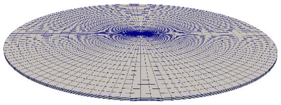 As shown in Figure 2, a O-block mesh was used to discretize the geometrical domain represented in Figure 1. Three different mesh refinement levels were created using the blockMesh application, being defined as M1: 15 × 30 × 4, M2: 30 × 60 × 8 and M3: 60 × 120 × 16, where M#: represents the spatial discretizations on the radial, azimuthal and longitudinal directions, respectively. The accuracies of the numerical torque calculations were accessed through the comparison with the analytical results given by Equations (8) or (9) via the application of Richardson’s extrapolation [] to the limit.