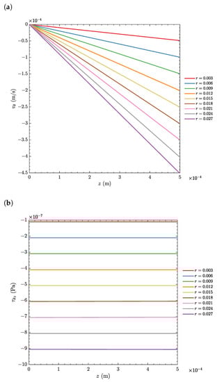 In this section, we start by validating the methodology for the calculation of the fluid velocity, stress tensor components, and torque expressions derived in Section 2.2. In Figure 3, we show the fluid azimuthal velocity component and the shear stress component at several radius locations. As expected from Equation (6), the azimuthal fluid velocity component profile is linear and the shear stress component is constant along the z-direction for each radial location.