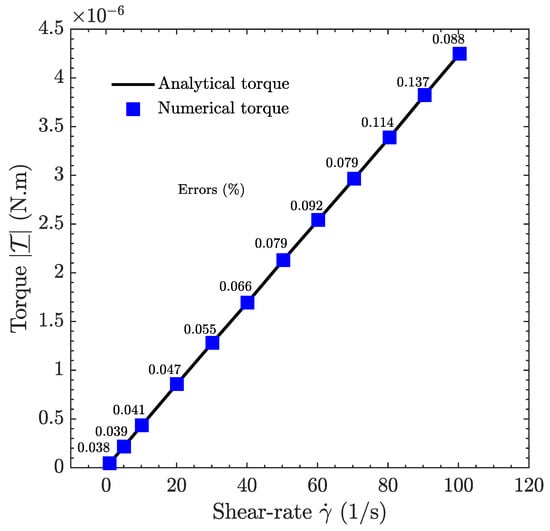 The numerically calculated torque for a Newtonian fluid is shown in Figure 5 and is compared with the exact value given by Equation (8). The relative error, in percentage, between the numerical torque results and the values of the analytical solution is also shown in Figure 5. For all shear rates tested (), the relative errors are less than . Note that the radius is fixed; thus, the dependence of the torque profile on the radius is not observed.