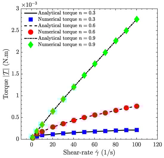 The torque results for a power law fluid were also numerically calculated and compared with the analytical solution from Equation (9) for , and (see Figure 6). Again, the numerical results and the values of the analytical solution agree remarkably well. We no longer have a linear profile. Introducing a nonlinearity into the constitutive equation leads to a nonlinear torque profile that depends on the power of n. For higher values of n () the Newtonian profile is restored and we observe an almost linear profile. For low values of n, the non-Newtonian flow behavior is more pronounced and the fluid has more difficulty in increasing the torque for higher shear rates. This means that the stresses on the wall are lower due to the strong shear-thinning effect leading to lower viscosity.