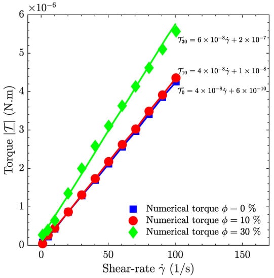 Figure 7 shows the comparison between numerical torque results for suspensions without particles and those with 10% and 30% of particle volume fractions for a Newtonian fluid. The numerical results shown in Figure 7 were fitted by a first-order polynomial. We can see that the ordinate of the intersection point of those polynomials with the y-axis increases with the increase of the particles volume fraction, which indicates that yield stress phenomena occur when the fluid is in the presence of particles, in accordance with the results published in the literature [,]. When increasing the shear rate, the fluid seems to show solid-like behavior at first (at really low shear rates), i.e., it does not deform any further, but at higher shear rates the fluid deforms. This could be due to the fact that the presence of solid particles gives the suspension a more solid-like behavior at low deformations. At higher deformations, the liquid-like behavior prevails and the suspension flows.