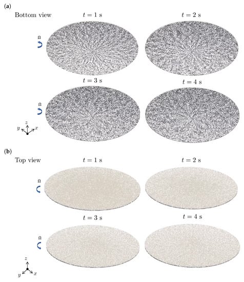 Note also the particle formation in the view from below (Figure 8a). Due to the particle–particle interaction and the resistance that the fluid exerts on the particles, a radial distribution of particles is observed for . As time increases, the particles become more random and dispersed, as expected. This result is not seen in the view from above and could therefore also be related to gravity.