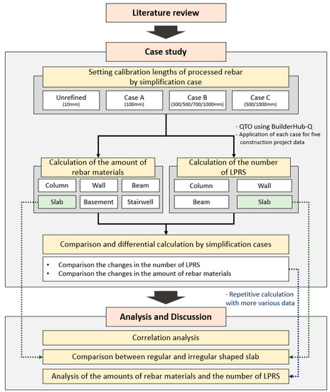As repetitive work can be required in this step, 3D BIM-based QTO is suitable because of its high precision and convenience. However, even though previous works explored rebar QTO and BIM-based QTO as theoretical studies, only a few studies have considered both an increase in the amount of rebars and a decrease in LPRS by simplification among case studies. Therefore, based on the status quo of the research, this study aims to find solutions to the following research questions by conducting a case study on various building design cases of several construction projects to collect data on the simplification method: