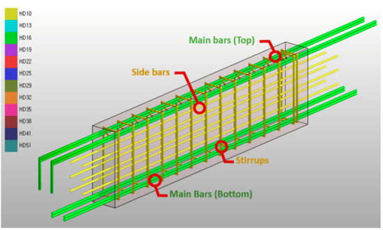 The beam consists of main bars, arranged axially to resist bending moments, and stirrups surrounding the main bars, in the lateral direction to resist shear forces. The main bars consist of a combination of top, bottom, and side bars (skin reinforcement), depending on the direction of the bending moment acting on the beam. In that case, the bending moment changes and is distributed by sections; thus, the beam is designed to be divided into the external, center, and internal sections. Figure 4 below shows an example of the rebar arrangement of beam members and the name of the rebar for each part.