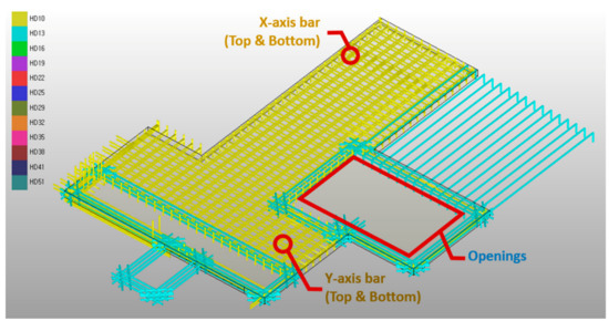 The slab is arranged in both the short-side and the long-side directions (X- and Y-axis respectively). In addition, depending on the location of the beam, the deformation increases as the distance from the beam increases. As a result, the beam is divided into the column and middle strip sections to design the rebar arrangement for slabs. Furthermore, additional rebar arrangements for slabs must be performed for relatively vulnerable areas, such as openings. The QTO of slabs requires six types of design drawings, including arrangement drawings for the top and bottom X-axis, the top and bottom Y-axis, and the top/bottom reinforcement drawings. Figure 5 below shows an example of the rebar arrangement of slab members and the name of the rebar for each part.