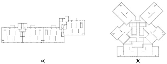 In performing rebar arrangement on the slab members of a building, square-shaped slabs are arranged in the longitudinal direction using long rebars of 8 m or more in length. However, in the case of irregular slabs that are not based on rectangular shapes (or with other shapes added), long rebars are not used frequently because they may suffer interference due to different axial directions. In addition, in case the slab’s long and short sides are not perpendicular, various types of LPRS are produced because different rebar lengths must be arranged at each point. In this environment, the efficiency of processed rebar length simplification was expected to be high. Thus, this study divided the slab shape into regular and irregular shapes to compare the reduction rates of the number of LPRS by simplification. Buildings consisting of only square slabs were classified as conventional shapes, as shown in Figure 6a, and the rest shown in Figure 6b were classified as irregular shapes. The comparison was conducted only on high-rise buildings, such as apartments and offices, whereas low-rise structures, such as security offices or underground parking lots, were excluded. The results of classifying each slab of the building into a regular or irregular shape are described in Table 12.