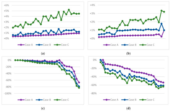 Distributions of the changing rates for: (a) amounts of rebars by cases for beam members; (b) also for slab members; (c) number of LPRS by cases for beam members; (d) also for slab members.