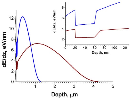 Deposited energy dependence on depth per one primary electron calculated for Eb of 10 keV (blue) and 20 keV (wine). The inset shows the deposited energy depth dependencies at a small depth.