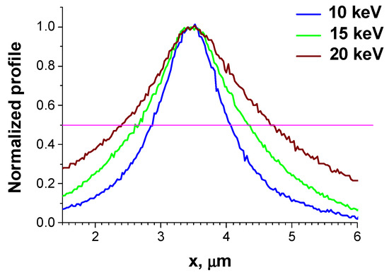 Profiles of the EBIC image of the same bright spot measured at a few Eb values. A solid line marks the half maximum position.