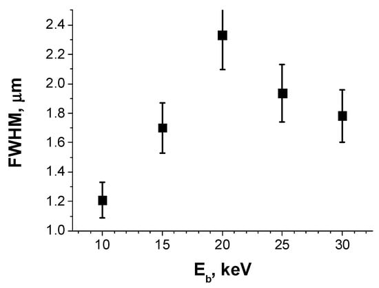 The typical normalized EBIC profiles of the same bright spot measured at Eb of 10, 15, and 20 keV are shown in Figure 7. It is clearly seen that the profile width essentially exceeds the e-beam size (which is about a few tens of nm) and increases with the beam energy. The full width at half maximum (FWHM) calculated based on the data in Figure 7 is equal to 1.2, 1.6, and 2.2 μm for 10, 15, and 20 keV, respectively. At Eb larger than 20 keV, the FWHM values do not increase further, but even show a tendency to decrease (Figure 8). As mentioned above, the number of carriers contributing to the induced current at a bright spot is 320 and 200 per one primary electron for 10 and 20 keV, respectively, while the total number of generated carriers at 20 keV is two times higher than that for 10 kV. This implies that the collection efficiency at 20 keV is about three times lower than that at 10 keV, and thus is in agreement with the theoretical predictions for the rectifying nanocontact [46,47], showing that the collection probability strongly decreases with the distance from the contact. This allows to explain the observed FWHM dependence on Eb. The width of the generation volume at z < R is roughly proportional to (z3/R)1/2, where z is the depth and R ~ Eb1.75 is the electron range [48]. Thus, while dimensions of the generation region are roughly proportional to R and increase with Eb, the width of a part of the generated volume adjusting the contact decreases with Eb. Besides, the penetration depth of the electrons increases with Eb, while the collection probability of the excess carriers strongly decreases for nanosize contacts. Therefore, a relative portion of the carriers generated in the vicinity of the top electrode, and thus contributing to the EBIC signal, increase with the increasing Eb. Competition of these factors explains the non-monotonic dependence presented in Figure 8. Thus, the observed Eb dependence of the bright spot width supports an assumption of the formation of a nanosize rectifying barrier at the conductive path/Si interface. It should be noted that, for the rectifying contact, the depletion region width, which plays the role of the collector for the minority carriers (holes), can vary from a few hundreds to several thousands of nanometers depending on the barrier height and the dopant concentration [49]. It should be emphasized that the real size of the conductive channels can essentially be smaller.