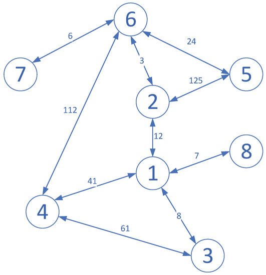 In Figure 1, nodes 7 and 8 are the isolated nodes that only have one edge connecting to other nodes. Since node 1 is the central note, node 8 could be considered as a sub-network. As mentioned above, the connection weight between node 1 and node 3 is small. It does not affect the traversal of the whole network. Therefore, we could separate nodes 3, 4, 6, and 7 as another sub-network. Additionally, nodes 2 and 5 constitute the rest of the sub-network.