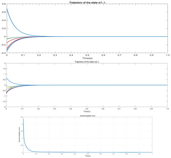 The trajectories of the state and error shown in Figure 3 adopted the network-partitioning method. As a comparison, the results are shown in Figure 4. It can be seen from the results that the synchronization errors of the two methods converge exponentially. However, the speed of this method is greatly improved.