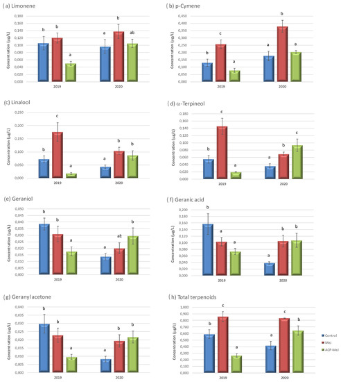 For the same year, p-cymene (Figure 1b), linalool (Figure 1c), and α-terpineol (Figure 1d), which are very important terpenoids for grape and wine aroma [36], increased their content in MeJ grapes, and decreased it in ACP-MeJ samples with respect to control one. In the case of geranic acid (Figure 1f), both treatments significantly decreased the amount of this compound. Finally, in the same year, total terpenoids concentration (Figure 1h) increased in grapes from the foliar application of MeJ, and decreased in grapes treated with ACP-MeJ with respect to control grapes.