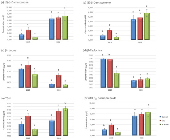 Figure 2 shows the concentration of C13 norisoprenoids found in the control and in the grapes from the applications to vines of MeJ and ACP-MeJ, in 2019 and 2020 seasons. In 2019, (E)-β-damascenone (Figure 2a), (Z)-β-damascenone (Figure 2b), and 1,1,6-trimetil-1,2-dihidronaftaleno (TDN) (Figure 2e), increased their concentration in MeJ grapes and decreased their concentration in ACP-MeJ samples with respect to control. The (E)-β-damascenone (Figure 2a) was the most abundant C13 norisoprenoid in the samples, predominantly over the rest of the compounds of this group. This fact is expected because this compound is one of the most abundant norisoprenoid in the grapes [12,41]. TDN is one of the most polarising, and maybe the less studied C13 norisoprenoid [39], its typical aroma descriptor is pretolor kerosene. In the case of β-ionone (Figure 2c), which provides violet notes [42], and β-cyclocitral (Figure 2d), both significantly decreased their amount in ACP-MeJ grapes relative to control and MeJ samples. Regarding the total C13 norisoprenoids (Figure 2f) in 2019, MeJ treatment increased its content with respect to control grapes. This could be probably due to the fact that the MeJ increases the activity of the enzymes involved in the synthesis of these compounds [43], which derive from biodegradation of carotenoids [40,44], whereas ACP-MeJ treatment decreased it. Therefore, despite applying the same product, the dose was 10 times lower, and maybe it was too low to affect enzyme activity.