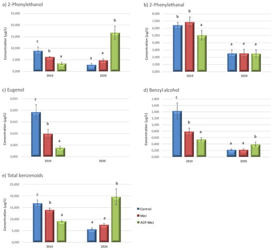 Figure 3 shows the concentration of benzenoids found in the control and in the grapes from the foliar treatments with MeJ and ACP-MeJ, in 2019 and 2020 seasons. In 2019, 2-phenylethanol (Figure 3a), eugenol (Figure 3c) and benzyl alcohol (Figure 3d) decreased their concentration in grapes from both treatments (MeJ and ACP-MeJ) with respect to control grapes, with significantly lower content in ACP-MeJ samples. In the study of Marín-San Román et al., 2020 [12], 2-phenylethanol also decreased when MeJ is applied to vines. 2-Phenylethanal (Figure 3b) significantly decreased its amount in grapes from ACP-MeJ treatment with respect to control and MeJ samples. Finally, in 2019, the content of total benzenoids (Figure 3e) decreased with both treatments respect to control samples, with significantly lower content in ACP-MeJ grapes. This trend was also observed in the work of Gutiérrez-Gamboa et al., 2019 [38].