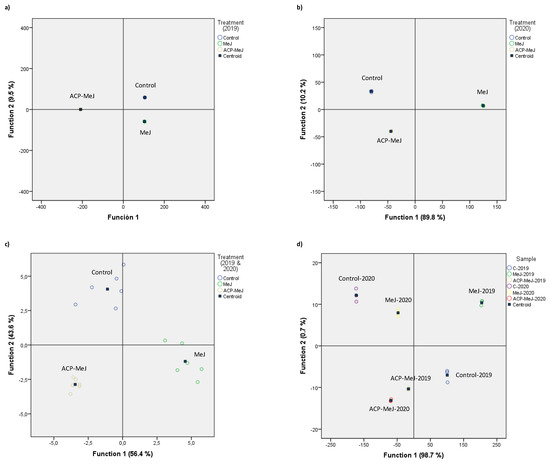 In order to classify the different samples, discriminant analysis was performed on data expressing the concentration of volatile compounds in control, MeJ, and ACP-MeJ samples. The results are shown in Figure 4. In 2019 season (Figure 4a), Function 1 explained a very high percentage of variance 90.5% and Function 2 explained only 9.5%, so the total of variance explained was 100%. The variables that contributed the most to the discriminant model were α-terpineol, 2-ethyl-1-hexanol, geraniol, and 1-hexanol (Function 1) and 2-ethyl-1-hexanol, geraniol, and TDN (Function 2). The discriminant model showed a good separation among the different samples. In the case of the data from 2020 (Figure 4b), Function 1 explained 89.8% and Function 2 explained 10.2%, (total variance explained = 100%). The variables that contributed the most to the discriminant model were: (Z)-3-hexen-1-ol, β-ionone, 2-phenylethanol, and 6-methyl-3,5-heptadiene-2-one for Function 1 and 2-phenylethanol, 2-ethyl-1-hexanol, and (E)-2-octenal for Function 2. Again, the discriminant showed a very good separation among the different samples. Figure 4c shows the discriminant analysis for both seasons, with treatment as factor. It can be observed that there is a good separation between the treatments. Function 1 explained 56.4% of the variance and Function 2 explained 43.6% (total variance = 100%). The variables with the highest contribution were p-cymene, and (E)-2-nonenal for Function 1, and heptanal, (E)-2-nonenal, and decanal for Function 2. Considering the sample as factor (Figure 4d), Function 1 explained almost all the variance 98.7%, and Function 2 only 0.7%, so the total of variance explained was 99.4%. Again, the discriminant shows a good separation between all samples. The variables that contributed the most to the discriminant model were (E)-β-damascenone, p-cymene, 1-octanol, and linalool for Function 1, and p-cymene, 2-phenylethanol, 1-octanol, and 1-hexanol for Function 2.