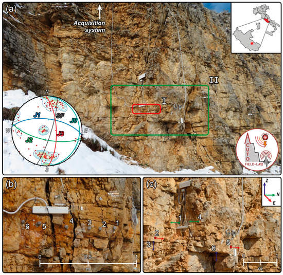 The Acuto field laboratory is located in the westernmost sector of an abandoned limestone quarry (Prenestina quarry) within the Municipality of Acuto (Central Italy) (Figure 2). It was designed and instrumented starting from November 2015 in the framework of multiple experimental activities managed by the CERI of Sapienza University of Rome. This natural test-site aims to investigate the ability of an integrated multiparametric monitoring system to decipher the role of environmental and anthropic stresses in determining the worsening of rock mass stability. The abandoned quarry, which is a few hundred meters NE from Acuto, is found on a monoclinic SW-dipping carbonate slope, where a succession of Meso-Cenozoic limestones is affected by NW–SE striking normal faults with offsets up to 10 m [46]. The monitoring system consists of several geotechnical and geophysical devices and was installed on the vertical rock wall outcropping in the western sector of the abandoned quarry. After a preliminary surveying stage and geomechanical characterization, a potentially unstable 20 m3 rock block was identified as the main target of monitoring activities [47]. This element was selected due to its severe fracturing degree and the presence of a rear discontinuity detaching the rock block from the quarry wall behind, thus predisposing this volume toward instability (Figure 2a). The monitoring system consists of (i) one temperature probe for rock mass temperature, (ii) six strain gauges installed in correspondence with microcracks, (iii) four extensometers installed on open fractures, and (iv) two fully equipped weather stations. The system is cable-connected to a Campbell Scientific CR1000 data logger collecting data with a 1 min sampling rate. Apart from the permanently installed devices on the rock block, the spectrum of monitoring activities at the Acuto field laboratory was enriched by several experimental activities carried out over the years.
