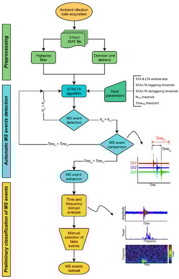 Flow chart summarizing the adopted workflow for the automatic detection and preliminary classification of MS events from ambient seismic noise continuous recordings.
