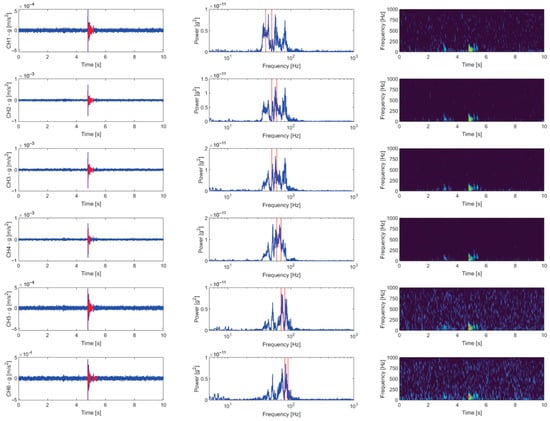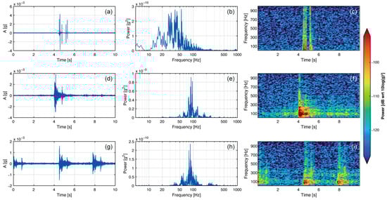 Following the automatic extraction of signals from the continuous recordings, the derived dataset was classified through a manual screening to exclude false detections from the analysis of the local microseismicity. The manual classification was performed by observing waveforms, power spectra, and spectrograms of every array channel (Figure 6). This technique is widely considered one of the fastest and most accurate methods for concurrently analyzing the time- and frequency-domain characteristics of signals [21]. This analysis led to the identification of multiple recurrent types of events. For the aim of this work, the event classification was performed between only two classes: the first one clustered all evident disturbances that could not be considered as natural events, and the second one comprised all the signals potentially related to the stability conditions of the monitored rock mass and rock block. Differently from several authors [8,21,29], within the latter class no further classification was made because it was not considered essential for the objective of this analysis.