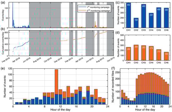 MS dataset collected at the Acuto field laboratory during the two monitoring campaigns conducted between February 2018 and October 2019. Number of events per day (a), cumulative number of events (b), and number of events detected per accelerometers during the first (c) and second monitoring campaign (d). Distributions of the detected events (e) and of the 1 h recorded files (f) during both monitoring campaigns as a function of the hour of the day.