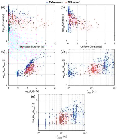 Results of the comparison between manually classified false and MS events based on time- and frequency-domain features. The following plots are presented: kurtosis vs. bracketed duration (a), kurtosis vs. uniform duration (b), maximum amplitude normalized to the mean of the envelope of the signal (Amax/Amean) vs. Arias intensity (IA) (c), Amax/Amean vs. the frequency peak of power spectra (fmax) (d), and the 10-Hz frequency band with the maximum spectral content (fband) (e).