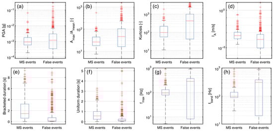 To evaluate the goodness of the manual classification, a quantitative comparison between the two identified classes was performed by analyzing several characteristic time- and frequency-domain parameters of the signals. In Figure 7, each panel compares couples of parameters that were considered for the investigation of the two clusters. The analysis of the relationship between kurtosis and event durations (bracketed and uniform) highlights how false events are concentrated in the left region of both plots (Figure 7a,b), thus confirming their very short and impulsive onset. In contrast, MS events show distributions characterized by variable durations. This behavior could be derived from the fact that both single events (uniform duration > 1–2 s) and sequences of multiple events (bracketed duration > 3–4 s) coexist within this class. The most evident difference between the kurtosis values of these clusters is the broader variability that characterizes the class of false events, with values ranging from 101 up to more than 103 (Figure 7a,b). Since the kurtosis of the envelope describes the flatness or peakedness of a random variable distribution compared to a normal distribution, high values of this parameter are expected for impulsive transients, while low values are typical of background noise [21,55]. By observing the almost linear relationship between the normalized maximum amplitude (Amax/Amean) and the Arias intensity (IA), two distinct alignments of MS and false events are evident (Figure 7c), with the latter class characterized by higher Amax/Amean values than the former within the same interval of IA. In addition, a clear cluster of false events is concentrated at very low Amax/Amean and IA values, probably describing noise transients rather than energetic electrical disturbances. Along with these results, the most significant differences observed between the two manually identified classes are shown in panels d and e of Figure 7. In these plots, the spectral content of all events, represented both in terms of peak frequency (fmax) and 10-Hz frequency bands (fband), was compared to their Amax/Amean values. The cluster of MS events is characterized by a frequency range spanning between 40 and 110 Hz, while the cluster of false events exhibits a bimodal distribution with two isolated local maxima located at very low (<10 Hz) and very high frequencies (>300 Hz). A synthesis of the eight parameters considered for comparing the identified classes of events is presented in Figure 8. As previously stated, the objective of this analysis was to produce a comparison between MS and false events that could strengthen the outcomes of the manual classification through the investigation of characteristic time- and frequency-domain features.