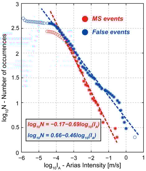 Based on the obtained results and considering MS and false events as two separate clusters, the relationship between event frequency and intensity was analyzed for both clusters according to the modified Gutenberg–Richter power law (Equation (5)). Due to the impossibility of locating event sources and estimating their magnitudes, these frequency–intensity curves were built considering the cumulative number of events having IA values greater than a certain IA. Their b-values were computed through linear regression (Figure 9). From the obtained results, which can be considered to be statistically significant in virtue of the high values of R-square (~0.98), the two clusters are characterized by different frequency–intensity distributions having b-values of 0.69 (MS events) and 0.46 (false events).