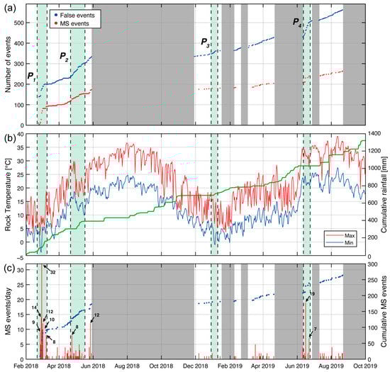 Comparison between the temporal evolution of MS events and environmental factors at the Acuto field laboratory: cumulative number of MS and false events computed over the entire monitoring period (a); daily maximum–minimum rock temperature (red and blue lines) and cumulative rainfall (green line) (b); daily and cumulative number of MS events (c). Four time intervals (P1–P2–P3–P4) are highlighted in all plots representing the periods in which the highest increments in both MS and false event occurrence were observed. Gray areas in panels (a,c) represent periods in which the MS monitoring network was not working due to power supply interruptions.