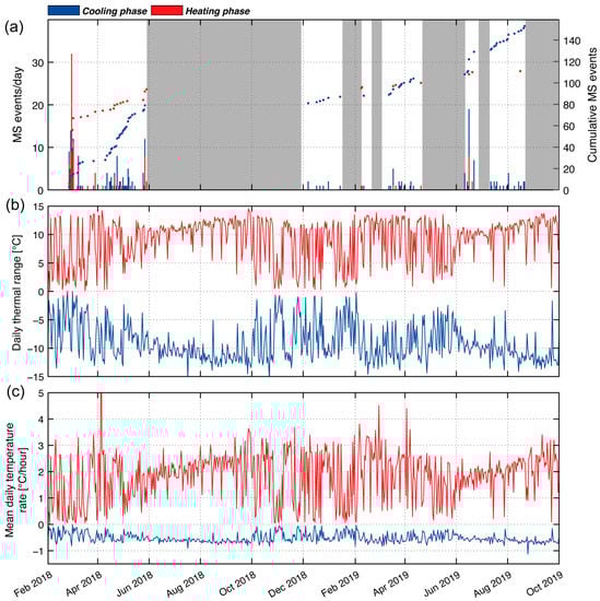 Comparison between the distribution of MS events (a), daily thermal ranges (b), and mean daily temperature rates (c). In each plot, the distinction between the heating (in red) and cooling (blue) phases of the rock mass is proposed with a view to investigate the response of the jointed rock block to different thermal regimes of increasing (heating) or decreasing (cooling) temperatures. Gray areas in panel (a) represent periods in which the MS monitoring network was not working due to power supply interruptions.