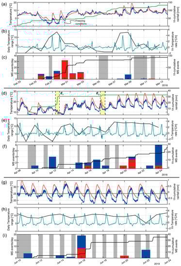 The other two investigated periods are instead more representative of the environmental boundary conditions of the area. For example, during the second period spanning from 8 April 2018 to 25 April 2018, 29 MS events were detected, but this value is certainly underestimated due to the periodic interruption of the MS monitoring system at night (Figure 12d–f). Near-surface temperatures show a decreasing trend during the first days (from 8 April to 13 April) that is related to a minor meteorological perturbation which caused temperature rates and gradients to significantly vary (Figure 12e). One of the most distinct features of this monitoring interval with respect to the winter storm is represented by the higher correlation that can be found between MS events and rainfalls, rather than with temperature fluctuations. Two rainfall events characterized by different intensities (E1 and E2, Figure 12d) may be regarded as the primary causes of the MS events that occurred during and immediately after these rainfalls (Figure 12f), while daily temperature ranges and rates do not exhibit significant variations. The last days of this period are instead characterized by the absence of rainfalls and by a steady increase in MS events, with a maximum peak of eight events on 24 April 24 that are associated with an increasing trend of temperatures which determined the stabilization of high temperature ranges and rates.