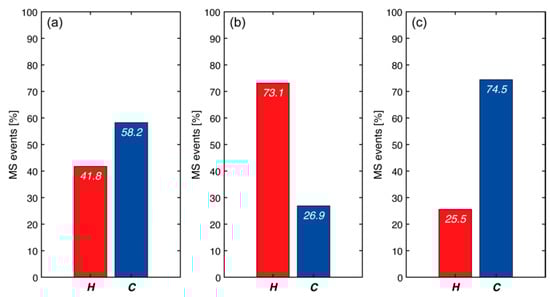 Percentage distribution of MS events during heating (in red) and cooling phases (in blue) for the whole monitoring period (a), the only winter storm of February 2018 (b), and for the entire monitoring period excluding the winter storm (c).