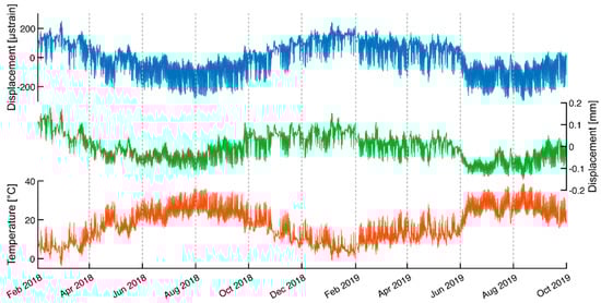 Temporal evolution of displacement (blue and green lines) and rock temperature (orange line) monitoring timeseries recorded by the permanent multiparametric monitoring system at the Acuto field laboratory.