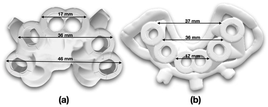 Stereolithography reference images with indicative length measurements in millimetres (.stl) of implant surgical guides. (a) Upper; (b) lower.